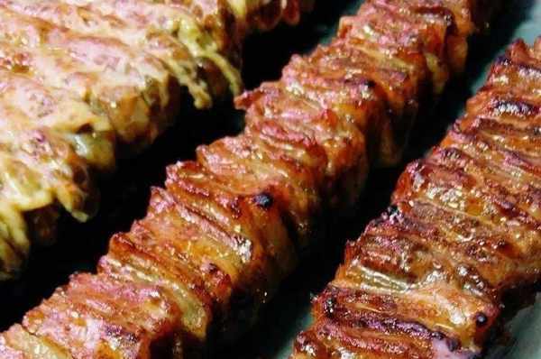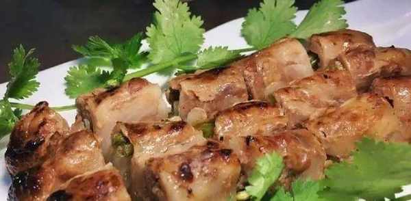 燒腱靈取自於鴨鴨鵝的腱,或是去除瞭筋膜的豬腰、豬心等內臟類,也有一些會選用豬前腿的瘦肉。鐵絲串著,接著加入調料料酒、鹽巴、白糖,再加點蔥白,將其卷成圓力筒,串起來燒烤。烤好後把這一條條“圓筒”從鐵叉上取下來,乘熱切成寸段,