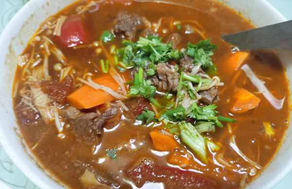 所以還是先來看一下他們吃的菜都有什麼?第1道菜是西紅柿燉牛腩,做這道菜的時候先處理西紅柿,然後把它的皮兒剝掉,然後切好放在一邊備用。再把牛腩冷水下鍋,摘下牛腩的時候放一些薑片和料酒在裡面,這是為瞭去除腥味兒。最後在炒鍋裡面加入適量的油,然後把西紅柿和番茄醬放在一起翻炒,最後將煮好的牛腩再倒進鍋裡面炒一下。
