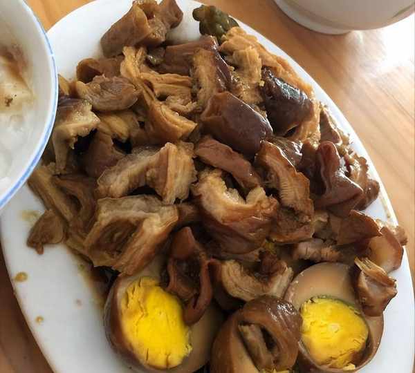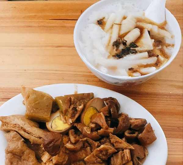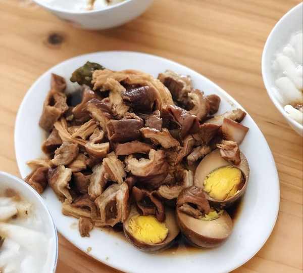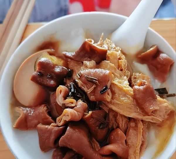 這個粿汁的價格不定,豐儉由人,普通的10元15元都能吃,喜歡吃鹵水的20元30元也可以點,也可以單點鹵水拼盤,除瞭豬大腸還有鹵蛋腐皮等等,都是鹵香味十足。方慶雲要瞭一個20元的粿汁,端上來面上是香菜,可以提香增味,下面是鹵大腸,大腸處理得很幹凈沒有異味,而且鹵味很重,但是吃起來又很清爽,鹵得很入味。老板會把鹵好的料堆在旁邊,客人要吃啥再放入鹵鍋加熱,這樣更入味瞭。熱騰騰的鹵汁香彌漫瞭整間屋子,讓那個人口水直流。