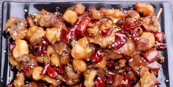 此菜以雞肉為主料,再加以幹辣椒和幹花椒精制而成,辣子雞口感麻辣鮮香、雞肉外酥內美,同樣是一道深受愛酒人士推崇的下酒好菜。