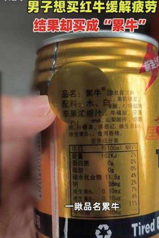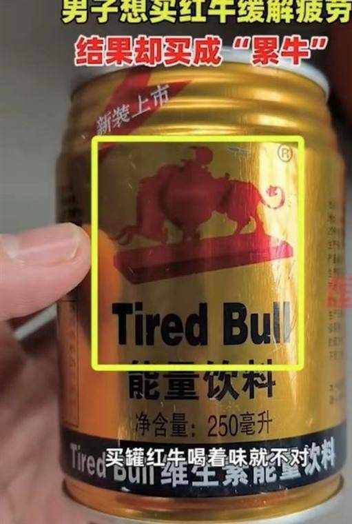 近日,一位網民在黑龍江伊春購買紅牛以消除疲憊,但一口飲下後,卻覺得口味怪怪的,再一看,瓶子上的 logo和公司的名字都與其不符,這才知道自己購買的竟是“累牛”。有網民表示:一頭紅牛,一旦疲倦起來,就會變成“累牛”。