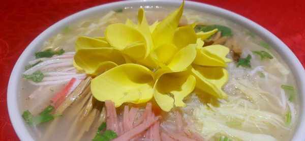 洛陽燕菜又稱牡丹燕菜,是豫西名菜,主要食材有白蘿卜、海參、 魷魚和雞肉,外形潔白如玉,鮮香味美,酸辣可口。