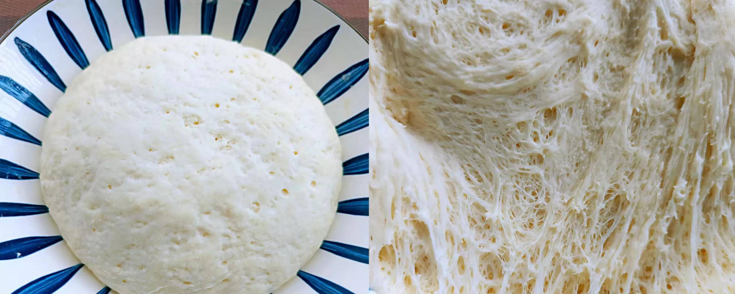 ①取出300克面粉,加入3克鹽攪拌均勻。酵母粉放入溫水中攪拌一下,一邊攪拌面粉一邊把水倒入面粉中。等攪拌成絮狀時用手揉成一個光滑的面團,放入碗中,蓋上保鮮膜,醒發40分鐘。待面團表面有很多氣孔,或者拉開成棉絮狀時就發酵好瞭。