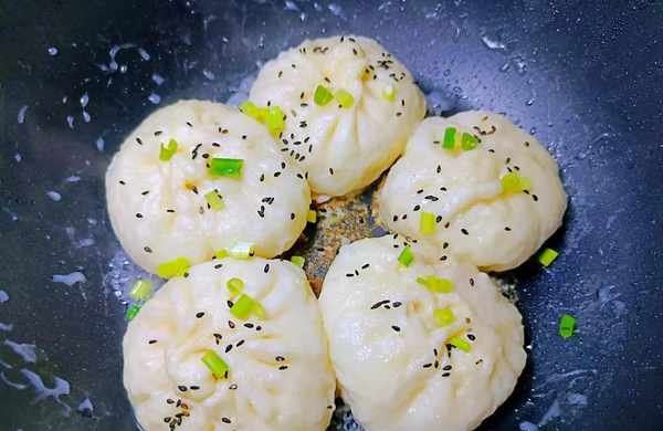 ⑨等到包子底部都結一層黃黃的殼時撒點蔥花,燜幾十秒就可以食用瞭。這個時候蒸的包子也好瞭,關火後燜5分鐘也可以取出來瞭。
