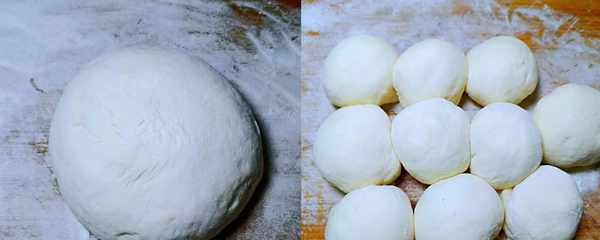 ⑤我們把發酵好的面團取出來,揉一會兒,排出空氣。把面團切成大小相似的小劑子,再團圓。