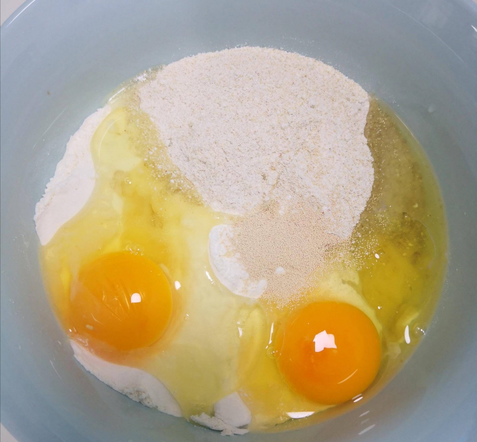 大碗中加點莜麥面粉、高筋面粉,兩者比例是1:5或者1:4,加兩個雞蛋、適量酵母,酵母的量是面粉總重的百分之一,加5克玉米油,加點油可以防止烤制後的成品太幹,加兩個雞蛋不僅增加蛋香味還能彌補少油易發幹的不足。