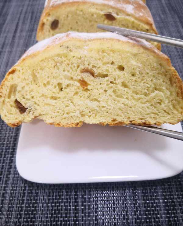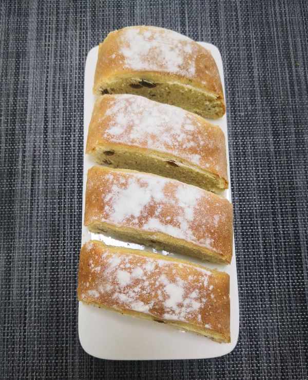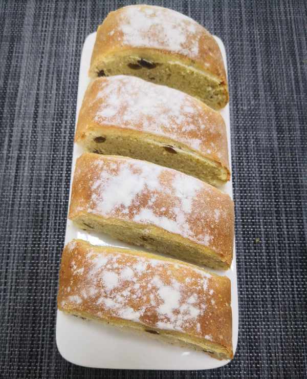 切成小塊吃起來更方便,外焦裡軟,蛋香混合著葡萄幹的香甜,越嚼越香。