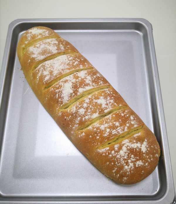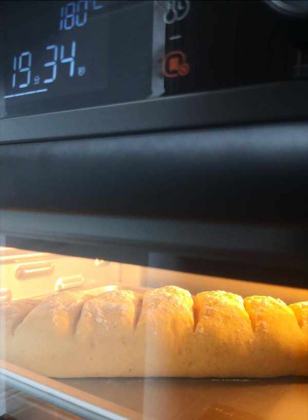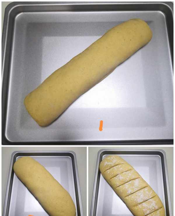 1.烤盤上刷少許食用油放置粘黏(傢裡沒有油紙瞭,墊油紙防黏效果更好)把生胚放在烤盤裡,因生胚較長,斜著擺放,好讓生胚有足夠的空間進行二次發酵。