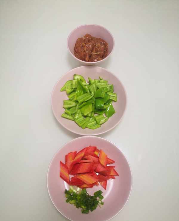 瘦肉、胡蘿卜、青椒、香蔥。