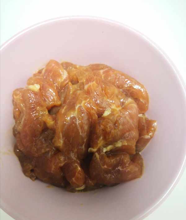 肉切薄片,加鹽、生抽、少許老抽、純藕粉或者淀粉、少許熟食用油,反復抓拌至上漿後醃制20分鐘。