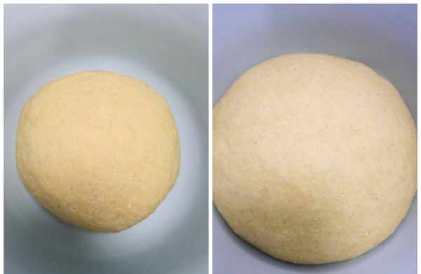 先拌均勻再少量多次的邊添加溫水、邊攪拌面粉,上手揉成偏軟點的面團,油少還想成品不發幹、不發硬,面團一定稍軟些,這樣的面團有較多的水分,可以改善少油易發幹的不足。蓋上保鮮膜,發酵至兩倍大。