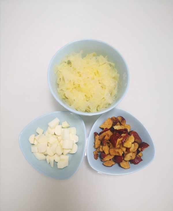 銀耳泡開後清洗幹凈並撕碎些,山藥去皮切成小塊,紅棗清洗幹凈後去核切成小塊。