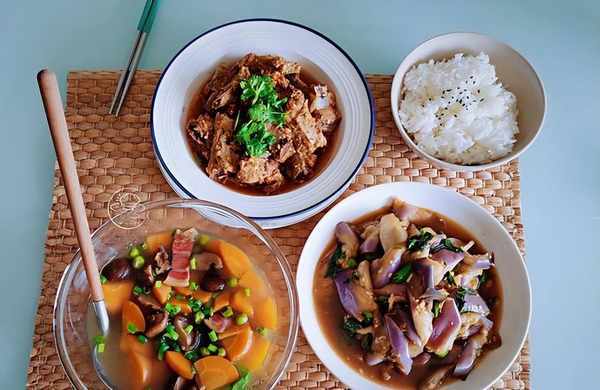 蒸排骨 + 燒茄子 + 胡蘿卜香菇湯