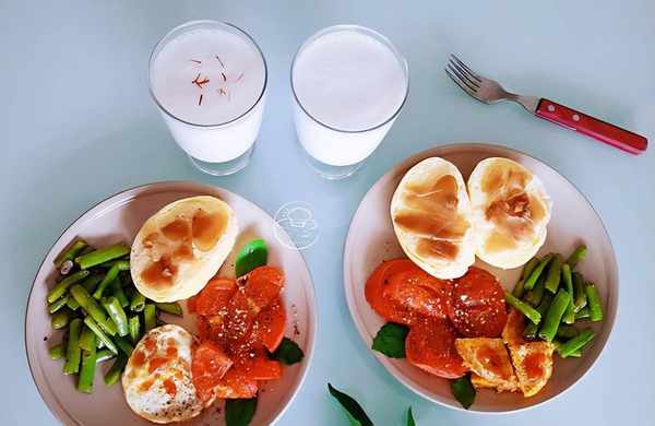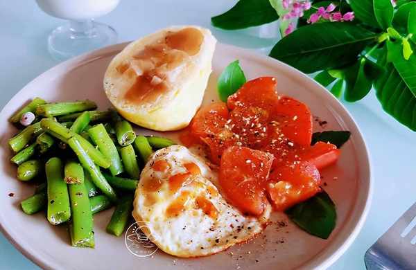 燕麥奶 + 雞蛋饅頭 + 水煮四季豆 + 油煎西紅柿