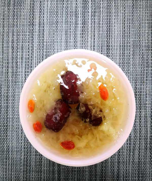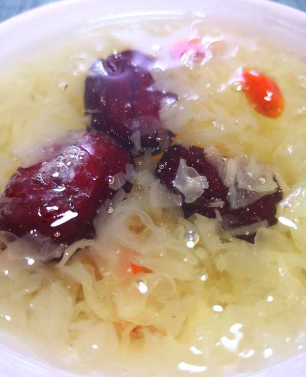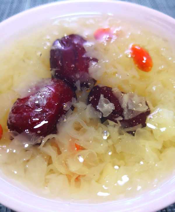 銀耳泡開後洗凈並撕碎些,水開後倒入銀耳、紅棗,大火煮開後轉中小火,繼續煮至銀耳出膠加點枸杞煮一兩分鐘即可,愛吃甜的根據自己喜歡加冰糖、白糖、蜂蜜都可以。