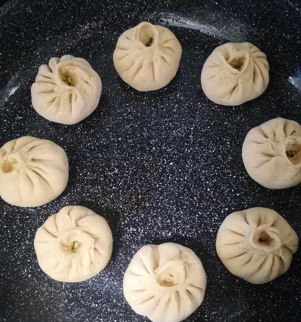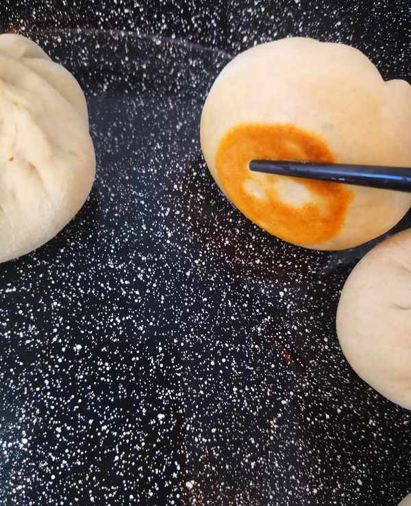 全部做好後,平底鍋刷油,把生胚放進鍋裡,每個生胚之間要留點距離,蓋上鍋蓋,二次發酵至明顯變大,約15分鐘。