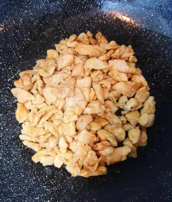 雞身材肉洗凈後切成丁,加鹽、生抽、少許老抽、原味藕粉或者淀粉、幾滴食用油,反復抓拌至上漿後醃制20至30分鐘,熱鍋涼油,倒入醃制好的雞肉翻炒至肉變色後盛出備用。