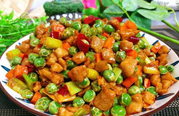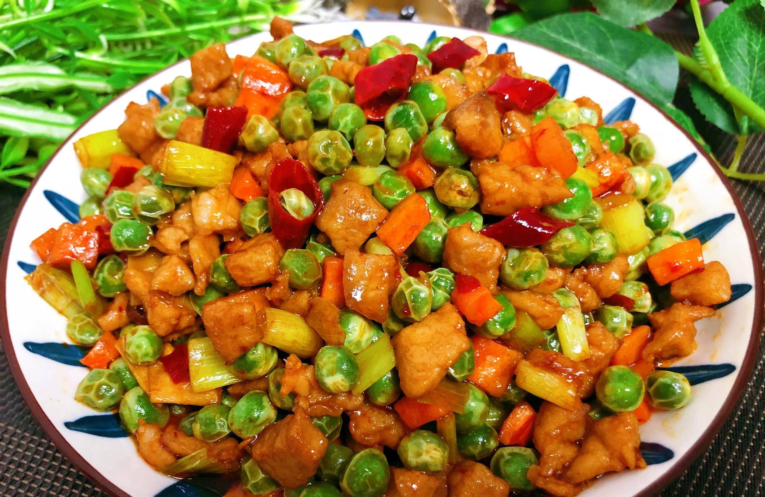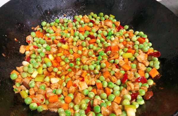(5)最後把胡蘿卜,豌豆倒進來翻炒片刻,放雞精,老抽,糖調味即可