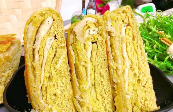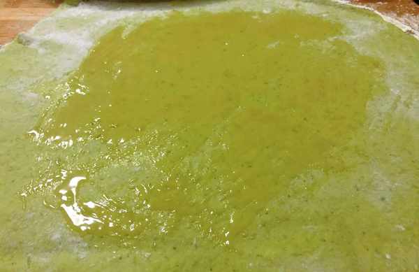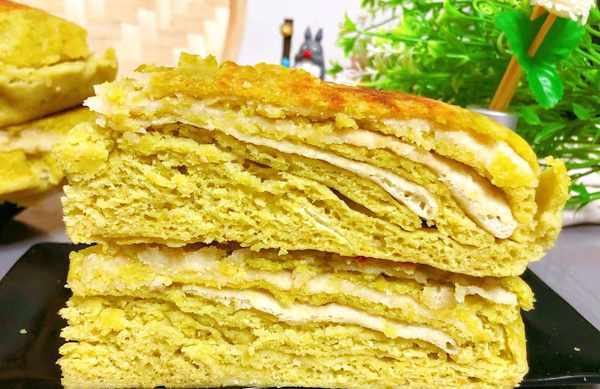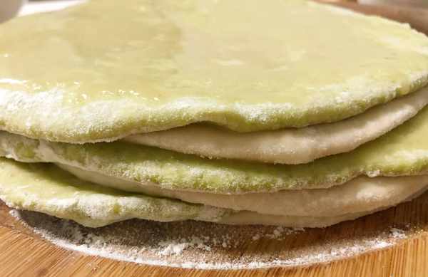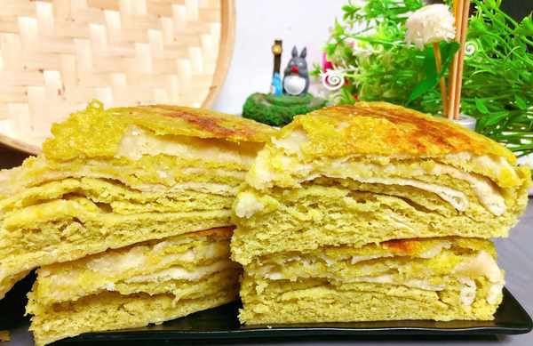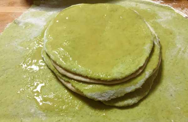 (10)接著取一個豌豆餅蓋上去,再刷一遍油酥,一層白面,一層豌豆面,以此類推,把剩下的4張餅用完,每一層都要刷油酥