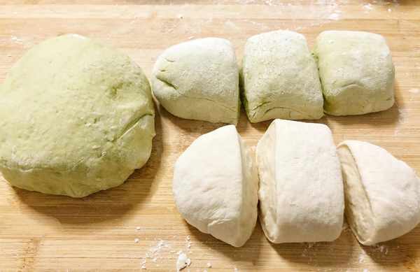 (7)先取出豌豆面,揉光滑分割成2份,然後取其中的一份再揉一下,分割成3小份;