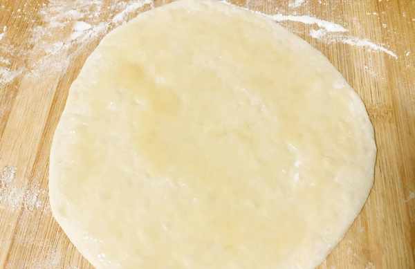 (11)把剛才分割好的大份豌豆團取出來,搟成大號的圓餅,中間刷油酥
