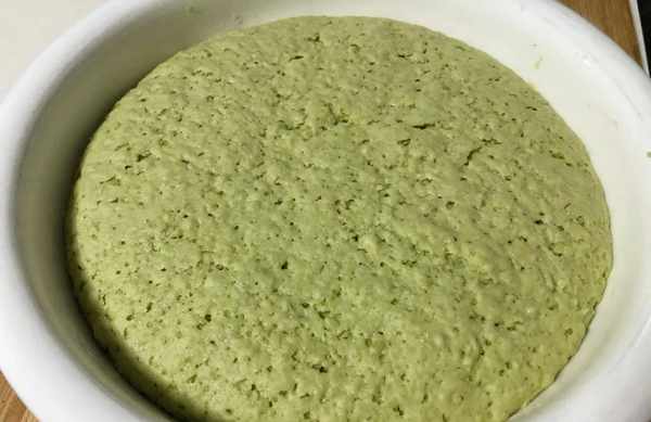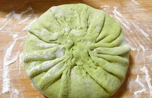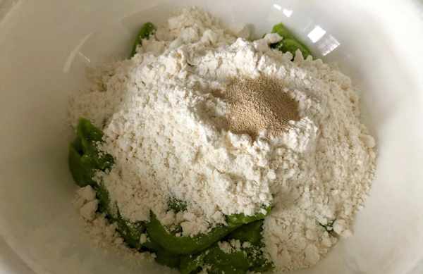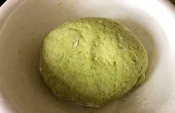 (3)打好的豌豆泥重量為450克,倒入450克面粉,5克酵母粉,攪成面絮狀,揉成面團,蓋上蓋子發酵