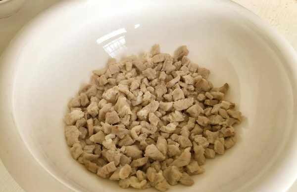(1)一小塊豬肉清洗幹凈,冷水下鍋焯水,放點料酒,薑片去除腥味,水開後轉小火煮3分鐘,煮好撈出來放涼,切成小肉丁