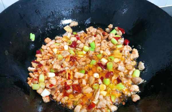 (4)鍋裡倒油,先放蔥薑辣椒炒出香味兒,然後倒入肉丁炒勻,接著放1勺豆瓣醬炒出紅油