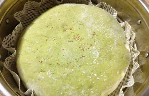 (14)然後把包子翻過來,直接放進鋪好蒸佈的蒸籠內,上面撒一層芝麻,輕輕地按壓一下粘牢固,蓋上蓋子二次發酵1個小時