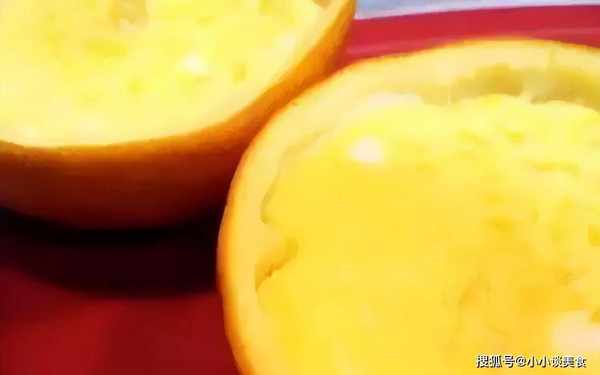 3、橙子對半切開,用手和勺子把橙子擠進去攪拌,把橙汁和橙肉擠到有蛋液的碗裡(其實不用擠太幹凈,反正蛋液要花點時間,還要倒入橘子皮裡,所以用勺子挑橘子果肉的時候不要把橘子皮弄破太用力)