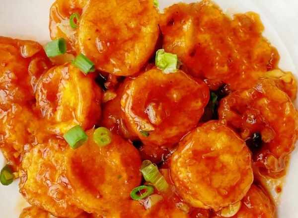 4、鍋留少許油,放蔥蒜爆香,倒入調好的醬汁,煮至濃稠冒泡倒入煎好的豆腐,翻拌均勻,撒上蔥花即可。