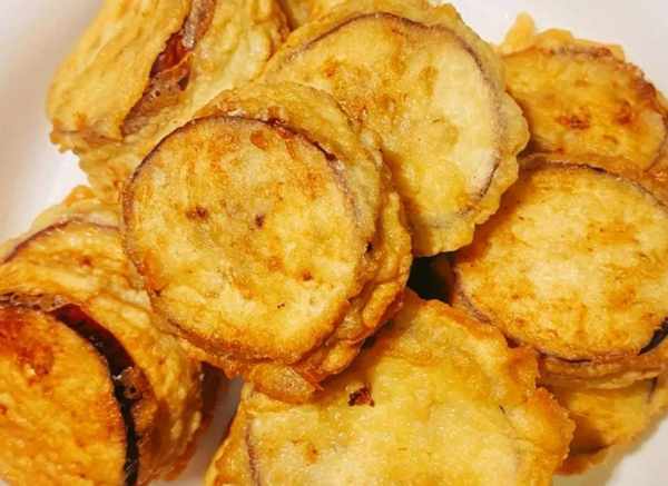 4、茄子中間夾上適量肉末,裹上面粉,油鍋八成熱放入茄盒炸至兩面金黃即可。