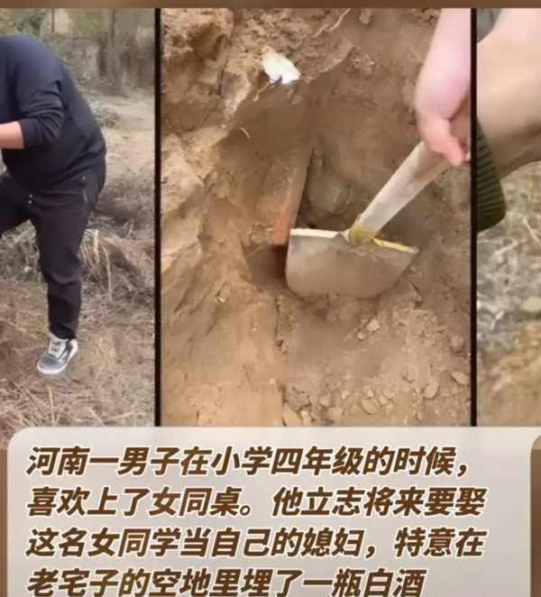 河北一個男孩,06年愛上瞭自己的小學四年級女同學,立志要娶那個女孩子。為瞭表示他對那份愛情的忠貞不二,特意在自傢院子裡埋瞭一瓶白酒,發誓將來和女孩結婚時,再挖開土把那瓶酒取出來喝。