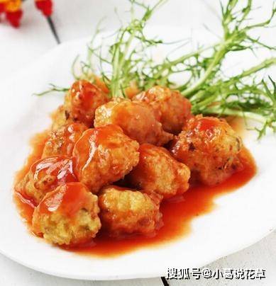 10、將做好的茄汁澆在丸子上,撒上白芝麻即可。