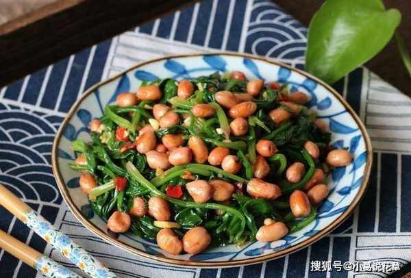 2、冷鍋冷油放入花生米,炒到發出噼裡啪啦的響聲盛出,花生米和菠菜加鹽和辣椒醬拌勻後裝盤。