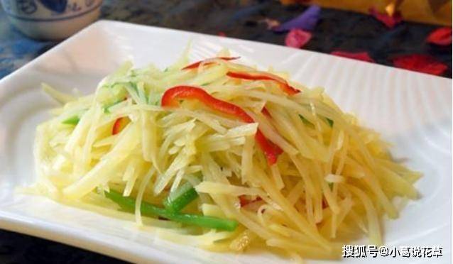 2、鍋中倒入油,倒入土豆絲,加入少許鹽,炒熟盛出;