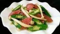 食材:秋葵100克;白玉菇100克;廣式臘腸2;生抽5克;大蒜5克;鹽適量