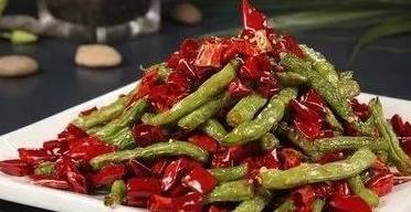 食材:豇豆、肉末、幹辣椒段、花椒粒、芽菜、蒜、生薑、鹽、料酒、醬油、雞粉
