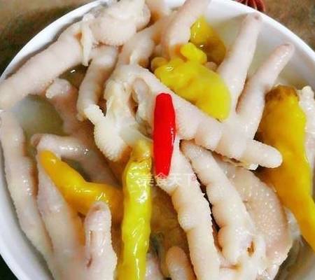 食材:鳳爪1000克、野山椒50克、泡菜酸水、芹菜、花椒、味精、雞精、鹽、胡椒少許