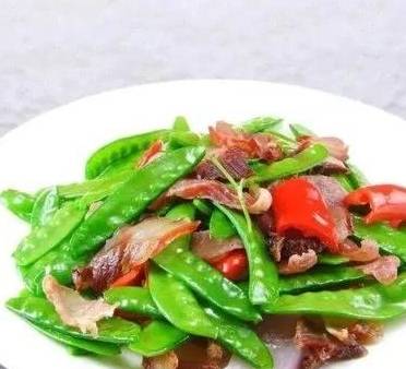 3、放入荷蘭豆與它一塊炒,多翻動。加入加工臘肉時的湯汁,大火收汁即成。