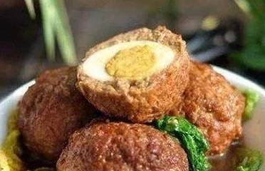 3、將五花肉蓉包裹在炸好的土雞蛋上,拍上一層薄薄的紅薯粉,入燒至七成熱的色拉油中,小火浸炸至色澤金黃,撈出控油。