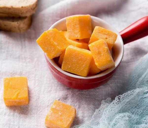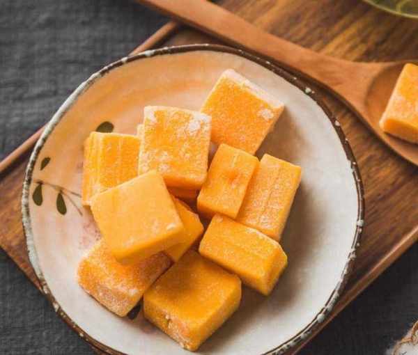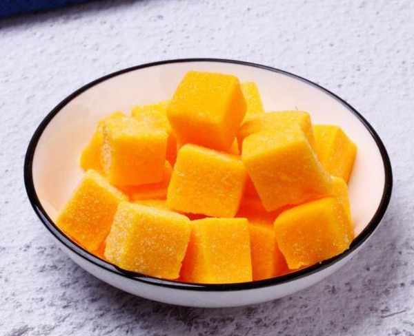 第三步:熬好的芒果泥倒入容器中,晾涼之後放進冰箱冷藏3個小時,冷藏至凝固,切成小塊,滾上一圈細砂糖,我們的芒果味軟糖就做好瞭。