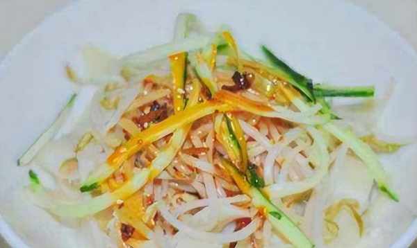 2、將粉皮在涼水內泡軟後切成絲,再放開水鍋內焯透再撈涼水內淘涼和豆芽放在一起,加入精鹽、醋、醬油,調拌均勻後放入盤內,灑上香油上桌食用。