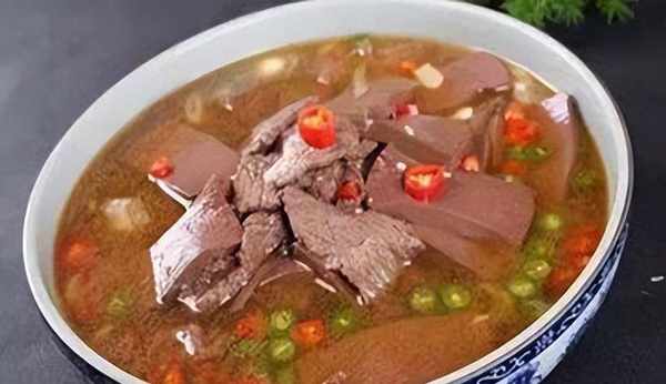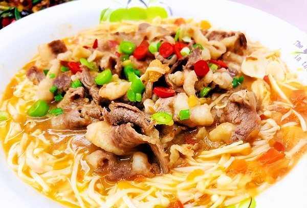 2、鍋內倒入清湯燒開,放入所有輔料,調入鹽、胡椒粉、白醋、指天椒水,再次燒開後下牛肉片和鴨血,稍煮後放入青紅椒圈,淋入芝麻油出鍋即成。