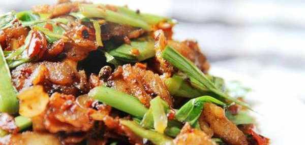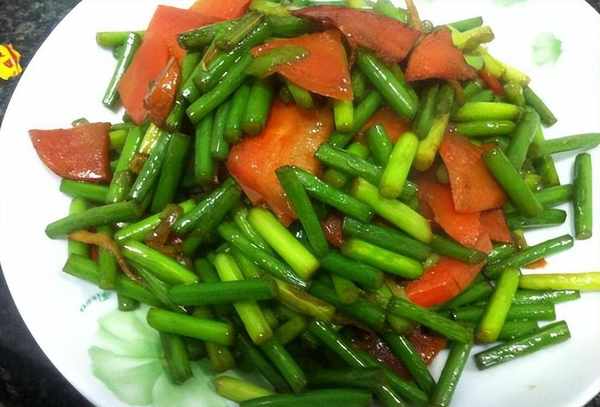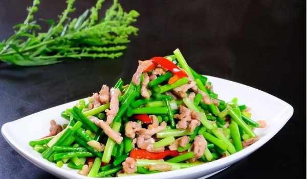 材料:豬肉,蒜苔、植物油,鹽,雞精,蔥薑蒜,醬油