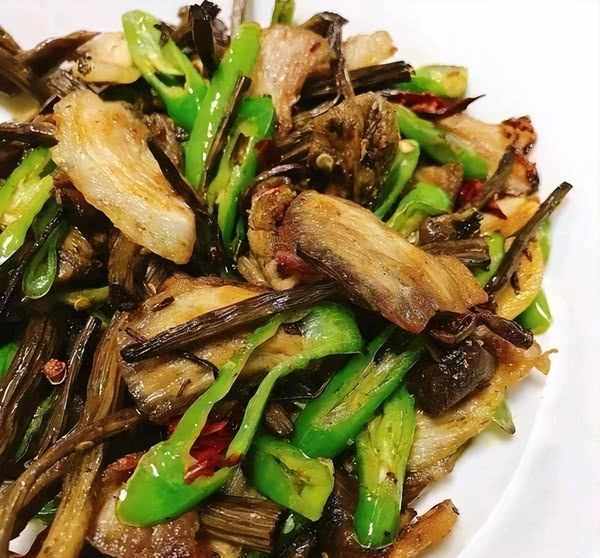 食材:五花肉、茶樹菇、青椒;調料:薑、蒜、幹辣椒、生抽、鹽、雞精、油;