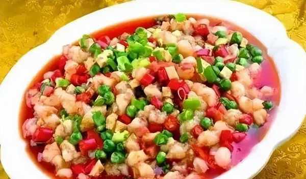 B料:薑粒10克,青豆30克,火腿丁20克,肉燕丁20克,青紅小米辣各15克