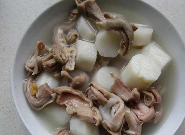 材料:山藥200克,豬肚150克,油、鹽、生薑、胡椒粉、料酒、雞精適量。
