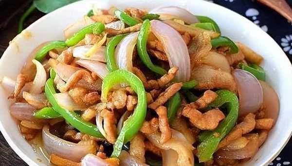 食材:洋蔥、青椒、豬肉、生薑、大蒜、植物油、黃酒、生抽、老抽、白砂糖、食用鹽、雞精