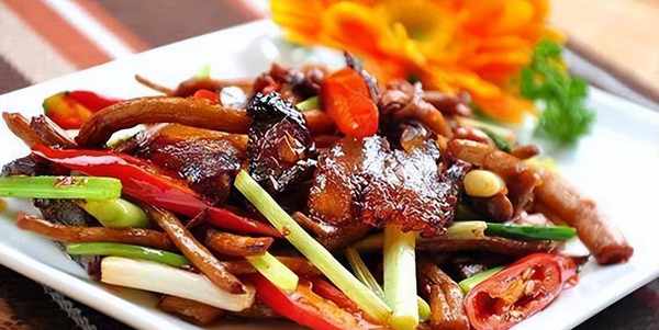 3、凈鍋重新上火,倒入色拉油燒至五成熱時,先下泡椒末、泡薑末和幹青花椒爆香,加入鴨腸、青二荊條辣椒節和大蔥節一起翻炒,其間調入鹽、味精、料酒、香油等,炒勻便出鍋裝盤成菜。